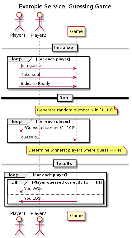 An example is as follows: A Service called “Guessing Game” generates a random number between 1 and 10. It then prompts the players to guess a number between 1 and 10. It determines which player is closest, and announces the winner.